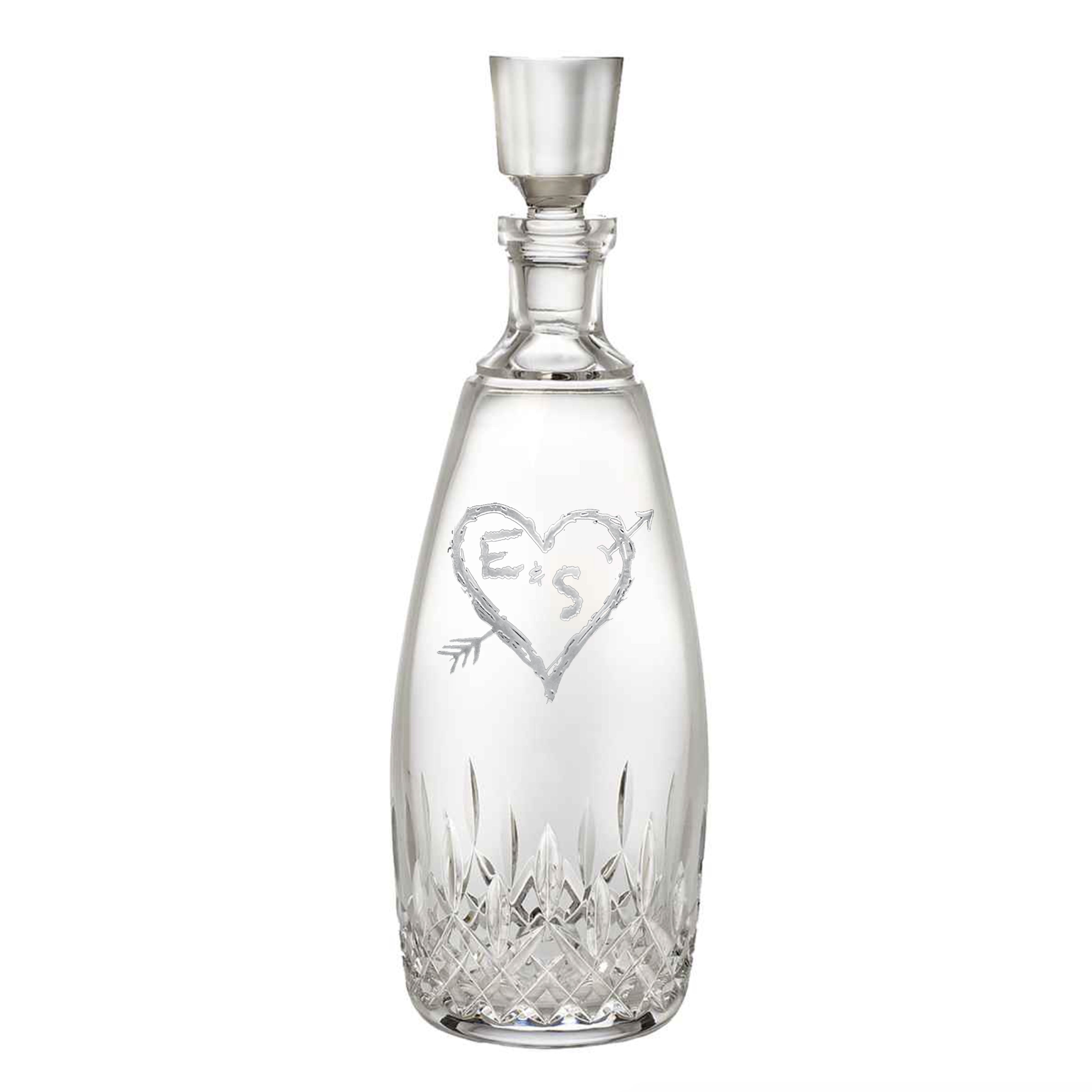 Our Lismore Essence Crystal Waterford Decanter is engraved with a sweetheart and arrow with lovers' initials as if they were carved into an old oak tree by young lovers proclaiming their love ever after. The Waterford decanter is a classic style gift for the man or woman who has everything and those with great taste who enjoy the finer things in life.