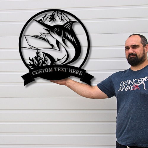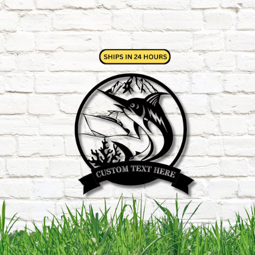 Some catches deserve more than a photograph; they deserve a permanent place on the wall. The Custom Metal Fishing Sign features a powerful marlin launching out of the water, surrounded by ocean coral and mountain scenery, all laser-cut in stunning detail into a bold circular metal frame. Your custom message scrolls across a ribbon banner at the bottom, making this piece as personal as it is jaw-dropping. Whether it's a name, a boat name, a favorite fishing spot, or a phrase only your crew would understand. This sign turns any wall into a deep-sea trophy moment.