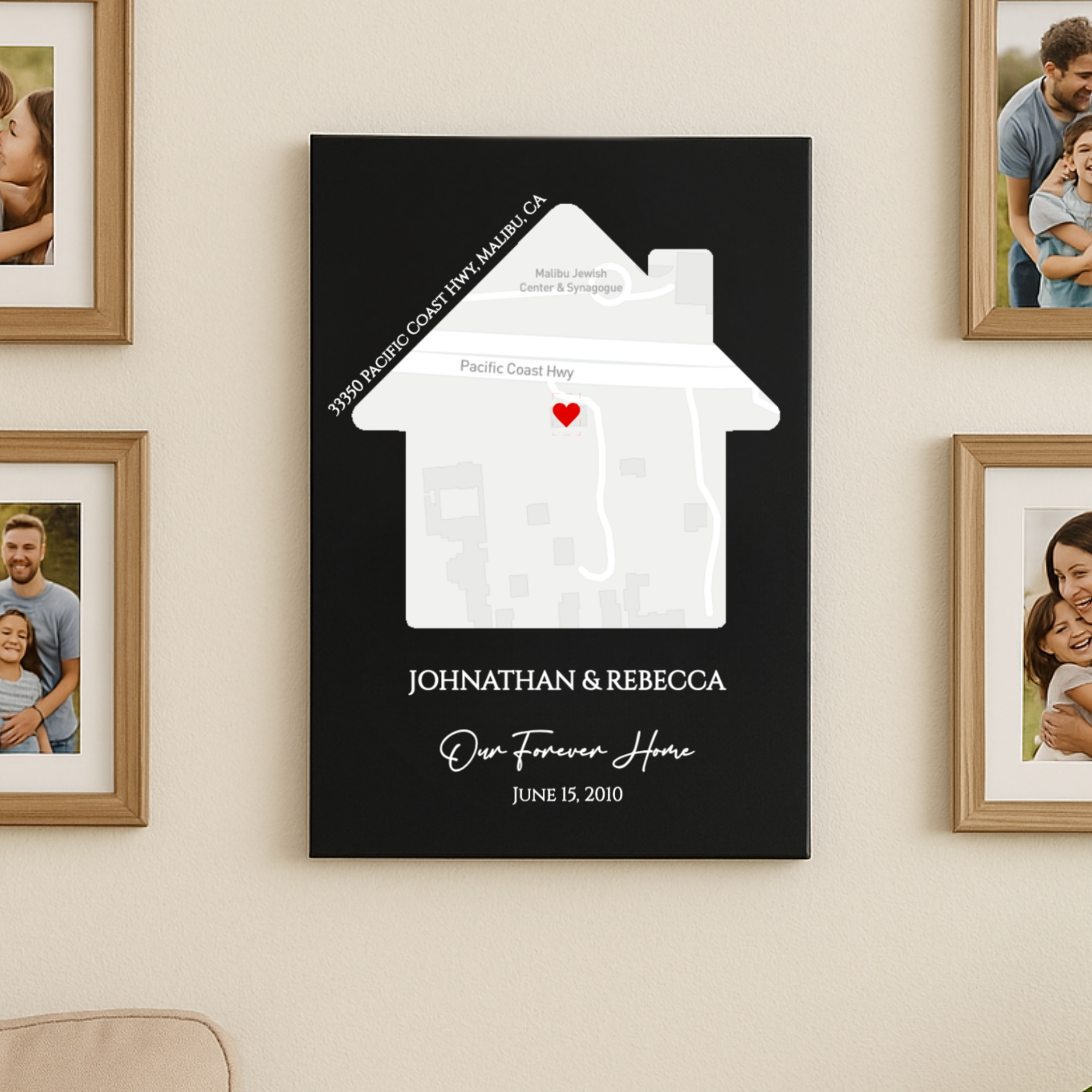 Your exact address becomes art: a house-shaped map with a heart pinpointing the place that matters most. Customize every detail, your names, address, a meaningful phrase like "Home Sweet Home" or "Where Our Story Began," and a date that changed everything. Laser-engraved on premium black leatherette with crisp white detailing, it's heirloom-quality beautiful. Perfect for newlyweds, new homeowners, milestone anniversaries, or anyone who's found their place in the world.