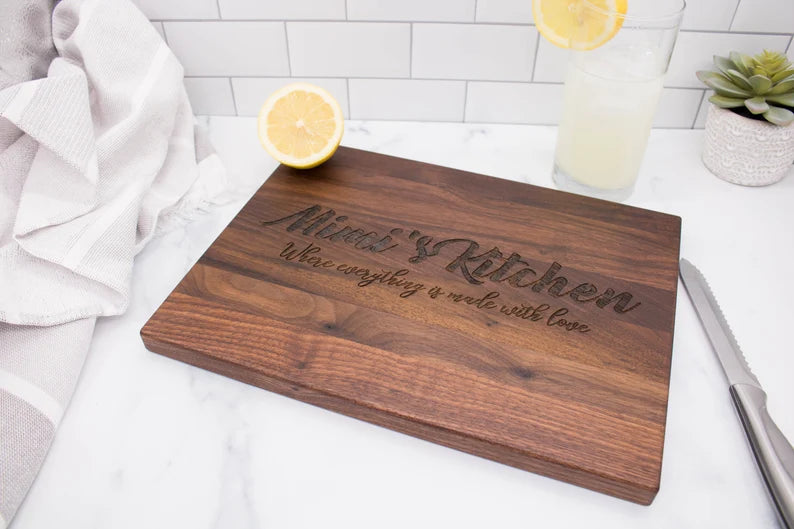 Our boards are made from American lumber! All of our cutting boards are hand-made at another small family-run business. Buying from a small business means your cutting boards are hand-selected and inspected for quality. After engraving our boards are hand finished with food-safe oils to preserve the beauty of the natural wood for months. All of our cutting boards come with care instructions to keep your board looking like new for years to come!
